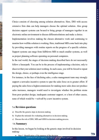%u062c%u0645%u064a%u0639 %u0627%u0644%u062d%u0642%u0648%u0642 %u0645%u062d%u0641%u0648%u0638%u0629 %u0640 %u0627%u0625%u0644%u0639%u062a%u062f%u0627%u0621 %u0639%u0649%u0644 %u062d%u0642 %u0627%u0645%u0644%u0624%u0644%u0641 %u0628%u0627%u0644%u0646%u0633%u062e %u0623%u0648 %u0627%u0644%u0637%u0628%u0627%u0639%u0629 %u064a%u0639%u0631%u0636 %u0641%u0627%u0639%u0644%u0647 %u0644%u0644%u0645%u0633%u0627%u0626%u0644%u0629 %u0627%u0644%u0642%u0627%u0646%u0648%u0646%u064a%u062973lOMoAR cPSD|10120753Choice consists of choosing among solution alternatives. Here, DSS with access extensive firm data can help managers choose the optimal solution. Also groupdecision support systems can beused to bring groups of managers together in anelectronic online environment to discuss differentsolutions and make a choice.Implementation involves making the chosen alternative work and continuing tomonitor how wellthe solution is working. Here, traditional MIS come back into play by providing managers with routine reports on the progress of a specific solution. Support systems can range from fullblown MIS to much smaller systems, as well as project planning software operating on personal computers.In the real world, the stages of decision making described here do not necessarily follow a linearpath. You can be in the process of implementing a decision, only todiscover that yoursolution isnot working. In such cases, you will be forced to repeat the design, choice, or perhaps even the intelligence stage.For instance, in the face of declining sales, a sales management team may stronglysupport a newsales incentive system to spur the sales force on to greater effort. Ifpaying the sales force a highercommission for making more sales does not produce sales increases, managers would need to investigate whether the problem stems from poor product design, inadequate customer support, or a host of other causes,none of which would be %u2015solved%u2016 by a new incentive system.7.4. Revision questionsa) Describe the generic steps in decision makingb) Explain the rationale for evaluating alternatives in decision making.c) Discuss the role of DSS, MIS and GDSS in decision making process.7.5. SummaryIn this lesson, we began by looking at the generic steps involved in decisionmaking-%uf0b7 Step 1: Identification of the purpose of the decision