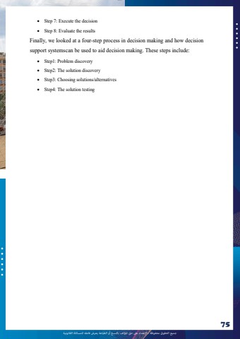 %u062c%u0645%u064a%u0639 %u0627%u0644%u062d%u0642%u0648%u0642 %u0645%u062d%u0641%u0648%u0638%u0629 %u0640 %u0627%u0625%u0644%u0639%u062a%u062f%u0627%u0621 %u0639%u0649%u0644 %u062d%u0642 %u0627%u0645%u0644%u0624%u0644%u0641 %u0628%u0627%u0644%u0646%u0633%u062e %u0623%u0648 %u0627%u0644%u0637%u0628%u0627%u0639%u0629 %u064a%u0639%u0631%u0636 %u0641%u0627%u0639%u0644%u0647 %u0644%u0644%u0645%u0633%u0627%u0626%u0644%u0629 %u0627%u0644%u0642%u0627%u0646%u0648%u0646%u064a%u062975lOMoAR cPSD|10120753%uf0b7 Step 7: Execute the decision%uf0b7 Step 8: Evaluate the resultsFinally, we looked at a four-step process in decision making and how decisionsupport systemscan be used to aid decision making. These steps include:%uf0b7 Step1: Problem discovery%uf0b7 Step2: The solution discovery%uf0b7 Step3: Choosing solutions/alternatives%uf0b7 Step4: The solution testing