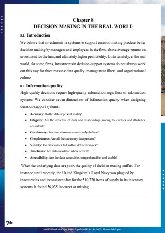 %u062c%u0645%u064a%u0639 %u0627%u0644%u062d%u0642%u0648%u0642 %u0645%u062d%u0641%u0648%u0638%u0629 %u0640 %u0627%u0625%u0644%u0639%u062a%u062f%u0627%u0621 %u0639%u0649%u0644 %u062d%u0642 %u0627%u0645%u0644%u0624%u0644%u0641 %u0628%u0627%u0644%u0646%u0633%u062e %u0623%u0648 %u0627%u0644%u0637%u0628%u0627%u0639%u0629 %u064a%u0639%u0631%u0636 %u0641%u0627%u0639%u0644%u0647 %u0644%u0644%u0645%u0633%u0627%u0626%u0644%u0629 %u0627%u0644%u0642%u0627%u0646%u0648%u0646%u064a%u062976lOMoAR cPSD|10120753Chapter 8DECISION MAKING IN THE REAL WORLD8.1. IntroductionWe believe that investments in systems to support decision making produce better decision making by managers and employees in the firm, above average returns oninvestment forthe firm,and ultimately higher profitability. Unfortunately, in the real world, for some firms, investmentsin decision-support systems do not always work out this way for three reasons: data quality, management filters, and organizational culture.8.2. Information qualityHigh-quality decisions require high-quality information regardless of information systems. We consider seven dimensions of information quality when designingdecision-support systems:%uf0b7 Accuracy: Do the data represent reality?%uf0b7 Integrity: Are the structure of data and relationships among the entities and attributesconsistent?%uf0b7 Consistency: Are data elements consistently defined?%uf0b7 Completeness: Are all the necessary data present?%uf0b7 Validity: Do data values fall within defined ranges?%uf0b7 Timeliness: Are data available when needed?%uf0b7 Accessibility: Are the data accessible, comprehensible, and usable?When the underlying data are poor, the quality of decision making suffers. For instance, until recently, the United Kingdom%u2019s Royal Navy was plagued by inaccuracies and inconsistent datafor the 510,770 items of supply in its inventorysystems. It found 56,035 incorrect or missing