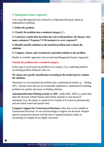%u062c%u0645%u064a%u0639 %u0627%u0644%u062d%u0642%u0648%u0642 %u0645%u062d%u0641%u0648%u0638%u0629 %u0640 %u0627%u0625%u0644%u0639%u062a%u062f%u0627%u0621 %u0639%u0649%u0644 %u062d%u0642 %u0627%u0645%u0644%u0624%u0644%u0641 %u0628%u0627%u0644%u0646%u0633%u062e %u0623%u0648 %u0627%u0644%u0637%u0628%u0627%u0639%u0629 %u064a%u0639%u0631%u0636 %u0641%u0627%u0639%u0644%u0647 %u0644%u0644%u0645%u0633%u0627%u0626%u0644%u0629 %u0627%u0644%u0642%u0627%u0646%u0648%u0646%u064a%u06298lOMoAR cPSD|101207533- Management Science ApproachA five-step MS approach Also referred to as Operation Research, based onmathematical modeling.1- Define the problem2- Classify the problem into a standard category (*)3- Construct a model that describes the real-world problem ( for finance: howmany customers? Expenses? # Of customers to cover expenses?)4- Identify possible solutions to the modeled problem and evaluate thesolutions5- Compare, choose, and recommend a potential solution to the problemSimilar to scientific approach is the second step Management Science Approach:Classify the problem into a standard category.In this step we need to put our problem in its category. E.g., marketing problem,accounting problem, financial, sales etc.We choose our specific classification according to the model used to evaluatethe solutions.Sometimes we can transform the problem into a mathematical model e.g., - findingGPA - because some data are not measurable (qualitative). mathematical modelingproblems are quicker and easier on finding solutions.Automated Decision-Making systems or ADS : unlike DSS, ADS is a system thattakes the decision without human intervention depends on rule based (ifstatement). E.g., fire alarm, at certain level of smoke it%u2019ll switch on automaticallyand start alarm sound and spread water.Computer Support for Unstructured Decisions: when data is not available inUnstructured Decisions, we use our knowledge to support our decisions. Requirespecial customized solutions with the lack of standard solutions unlike inaccounting for example IS are highly structured.