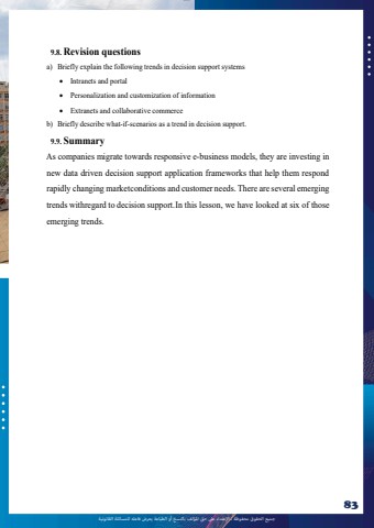 %u062c%u0645%u064a%u0639 %u0627%u0644%u062d%u0642%u0648%u0642 %u0645%u062d%u0641%u0648%u0638%u0629 %u0640 %u0627%u0625%u0644%u0639%u062a%u062f%u0627%u0621 %u0639%u0649%u0644 %u062d%u0642 %u0627%u0645%u0644%u0624%u0644%u0641 %u0628%u0627%u0644%u0646%u0633%u062e %u0623%u0648 %u0627%u0644%u0637%u0628%u0627%u0639%u0629 %u064a%u0639%u0631%u0636 %u0641%u0627%u0639%u0644%u0647 %u0644%u0644%u0645%u0633%u0627%u0626%u0644%u0629 %u0627%u0644%u0642%u0627%u0646%u0648%u0646%u064a%u062983lOMoAR cPSD|101207539.8. Revision questionsa) Briefly explain the following trends in decision support systems%uf0b7 Intranets and portal%uf0b7 Personalization and customization of information%uf0b7 Extranets and collaborative commerceb) Briefly describe what-if-scenarios as a trend in decision support.9.9. SummaryAs companies migrate towards responsive e-business models, they are investing in new data driven decision support application frameworks that help them respond rapidly changing marketconditions and customer needs. There are several emergingtrends withregard to decision support.In this lesson, we have looked at six of thoseemerging trends.