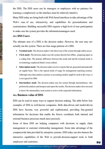 %u062c%u0645%u064a%u0639 %u0627%u0644%u062d%u0642%u0648%u0642 %u0645%u062d%u0641%u0648%u0638%u0629 %u0640 %u0627%u0625%u0644%u0639%u062a%u062f%u0627%u0621 %u0639%u0649%u0644 %u062d%u0642 %u0627%u0645%u0644%u0624%u0644%u0641 %u0628%u0627%u0644%u0646%u0633%u062e %u0623%u0648 %u0627%u0644%u0637%u0628%u0627%u0639%u0629 %u064a%u0639%u0631%u0636 %u0641%u0627%u0639%u0644%u0647 %u0644%u0644%u0645%u0633%u0627%u0626%u0644%u0629 %u0627%u0644%u0642%u0627%u0646%u0648%u0646%u064a%u062989the DSS. The DSS users can be managers or employees with no patience for learning a complextool, so the interface must be relatively intuitive.Many DSS today are being built with Web-based interfaces to take advantage of the Web%u2019s ease of use, interactivity, and capabilities for personalization and customization. Building successful DSS requires a high level of user participation to make sure the system provides the informationmanagers need.10.5. DSS UsersThe ultimate user of a DSS is the decision maker. However, the user may not actually run the system. There are four usage patterns of a DSS.%uf0b7 Terminal node: The decision maker is the direct user of the system through online access.%uf0b7 Clerk mode: The decision maker uses the system directly but offline , preparing input ona coding form. The primary difference between this mode and and the terminal mode isin technology employed (batch versus online).%uf0b7 Subscription mode: The decision maker receives reports that are generated automaticallyon regular basis. This is the typical mode of usage for management reporting systems.Although some data analysis systems or accounting models might be used in this ways, itis not typical for DSS.%uf0b7 Intermediary mode: The decision maker uses the system through intermediaries, whoperform the analysis and interpret and report the results, The decision maker does not needto know the intermediary used system to arrive at the requested information.10.6. Business value of DSSDSS can be used in many ways to support decision making. The table below lists examples of DSS in well-known companies. Both data-driven and model-driven DSS have become very powerful and sophisticated, providing fine-grainedinformation for decisions that enable the firm to coordinate both internal and external business processes much more precisely.Some of these DSS are helping companies with decisions in supply chain management or customer relationship management. Some take advantage of the companywide data provided by enterprise systems. DSS today can also harness theinteractive capabilities of the Web to provide decision-support tools to both lOMoAR cPSD|10120753employees and customers.