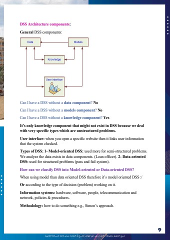 %u062c%u0645%u064a%u0639 %u0627%u0644%u062d%u0642%u0648%u0642 %u0645%u062d%u0641%u0648%u0638%u0629 %u0640 %u0627%u0625%u0644%u0639%u062a%u062f%u0627%u0621 %u0639%u0649%u0644 %u062d%u0642 %u0627%u0645%u0644%u0624%u0644%u0641 %u0628%u0627%u0644%u0646%u0633%u062e %u0623%u0648 %u0627%u0644%u0637%u0628%u0627%u0639%u0629 %u064a%u0639%u0631%u0636 %u0641%u0627%u0639%u0644%u0647 %u0644%u0644%u0645%u0633%u0627%u0626%u0644%u0629 %u0627%u0644%u0642%u0627%u0646%u0648%u0646%u064a%u06299lOMoAR cPSD|10120753DSS Architecture components:General DSS components:Can I have a DSS without a data component? NoCan I have a DSS without a models component? NoCan I have a DSS without a knowledge component? YesIt%u2019s only knowledge component that might not exist in DSS because we dealwith very specific types which are unstructured problems.User interface: when you open a specific website then it links user informationthat the system checked.Types of DSS: 1- Model-oriented DSS: used more for semi-structured problems.We analyze the data exists in data components. (Loan officer). 2- Data-orientedDSS: used for structured problems (pass and fail system).How can we classify DSS into Model-oriented or Data-oriented DSS?When using model than data oriented DSS therefore it%u2019s model oriented DSS :/Or according to the type of decision (problem) working on it.Information systems: hardware, software, people, telecommunication andnetwork, policies & procedures.Methodology: how to do something e.g., Simon%u2019s approach.