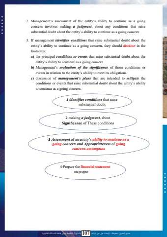 جميع الحقوق محفوظة ـ اإلعتداء عىل حق املؤلف 107 بالنسخ أو الطباعة يعرض فاعله للمسائلة القانونية1-identifies conditions that raise substantial doubt 2-making a judgment, about Significance of These conditions 3-Assessment of an entity’s ability to continue as a going concern and Appropriateness of going concern assumption4-Prepare the financial statementon proper 2. Management’s assessment of the entity’s ability to continue as a going concern involves making a judgment, about any conditions that raise substantial doubt about the entity’s ability to continue as a going concern 3. If management identifies conditions that raise substantial doubt about the entity’s ability to continue as a going concern, they should disclose in the footnotes: a) the principal conditions or events that raise substantial doubt about the entity’s ability to continue as a going concern b) Management’s evaluation of the significance of those conditions or events in relation to the entity’s ability to meet its obligations c) discussion of management’s plans that are intended to mitigate the conditions or events that raise substantial doubt about the entity’s ability to continue as a going concern.