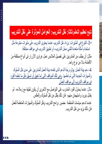 %u062c%u0645%u064a%u0639 %u0627%u0644%u062d%u0642%u0648%u0642 %u0645%u062d%u0641%u0648%u0638%u0629 %u0640 %u0627%u0625%u0644%u0639%u062a%u062f%u0627%u0621 %u0639%u0649%u0644 %u062d%u0642 %u0627%u0645%u0644%u0624%u0644%u0641 %u0628%u0627%u0644%u0646%u0633%u062e %u0623%u0648 %u0627%u0644%u0637%u0628%u0627%u0639%u0629 %u064a%u0639%u0631%u0636 %u0641%u0627%u0639%u0644%u0647 %u0644%u0644%u0645%u0633%u0627%u0626%u0644%u0629 %u0627%u0644%u0642%u0627%u0646%u0648%u0646%u064a%u0629113%u062a%u0627%u0628%u0639 %u062a%u0639%u0638%u064a%u0645 %u0627%u0644%u062a%u0639%u0644%u0645:%u062b%u0627%u0644%u062b%u0627: %u0646%u0642%u0644 %u0627%u0644%u062a%u062f%u0631%u064a%u0628: %u0627%u0644%u0639%u0648%u0627%u0645%u0644 %u0627%u0644%u0645%u0624%u062b%u0631%u0629 %u0639%u0644%u0649 %u0646%u0642%u0644 %u0627%u0644%u062a%u062f%u0631%u064a%u0628 %u2022 3 -%u0627%u0644%u062a%u0646%u0648%u0639 %u0641%u0649 %u0627%u0644%u0645%u062b%u064a%u0631%u0627%u062a: %u064a%u0632%u062f%u0627%u062f %u0646%u0642%u0644 %u0627%u0644%u062a%u062f%u0631%u064a%u0628 %u0639%u0646%u062f%u0645%u0627 %u064a%u062d%u062a%u0648%u0649 %u0627%u0644%u062a%u062f%u0631%u064a%u0628 %u0639%u0644%u0649 %u0645%u062b%u064a%u0631%u0627%u062a %u0645%u062a%u0646%u0648%u0639%u0629 %u0645%u062b%u0644 %u0627%u0633%u062a%u062e%u062f%u0627%u0645 %u0623%u0645%u062b%u0644%u0629 %u0645%u062a%u0639%u062f%u062f%u0629 %u0644%u0644%u0634%u0626 %u0645%u062d%u0644 %u0627%u0644%u062a%u062f%u0631%u064a%u0628%u060c %u0623%u0648 %u062a%u0637%u0628%u064a%u0642 %u0627%u0644%u062a%u062f%u0631%u064a%u0628 %u0641%u0649 %u0645%u0648%u0627%u0642%u0641 %u0645%u062e%u062a%u0644%u0641%u0629. %u0645%u062b%u0627%u0644: %u0623%u0646 %u064a%u0637%u0644%u0628 %u0645%u0646 %u0627%u0644%u0645%u062a%u062f%u0631%u0628%u064a%u0646 %u0639%u0644%u0649 %u062a%u0641%u0635%u064a%u0644 %u0627%u0644%u0645%u0627%u0644%u0628%u0633 %u0639%u0645%u0644 %u0639%u0631%u0627%u0648%u0649 %u0627%u0623%u0644%u0632%u0631%u0627%u0631 %u0641%u0649 %u0623%u0646%u0648%u0627%u0639 %u0645%u062e%u062a%u0644%u0641%u0629 %u0645%u0646 %u0627%u0623%u0644%u0642%u0645%u0634%u0629 %u0628%u062f%u0627%u0644 %u0645%u0646 %u0646%u0648%u0639 %u0648%u0627%u062d%u062f.4 -%u062f%u0639%u0645 %u0628%u064a%u0626%u0629 %u0627%u0644%u0639%u0645%u0644: %u064a%u0624%u062b%u0631%u062f%u0631%u062c%u0629 %u0627%u0644%u062f%u0639%u0645 %u0627%u0644%u0630%u0649 %u062a%u0642%u062f%u0645%u0647 %u0628%u064a%u0626%u0629 %u0627%u0644%u0639%u0645%u0644 %u0644%u0644%u0645%u062a%u062f%u0631%u0628%u064a%u0646 %u0639%u0644%u0649 %u0645%u062f%u0649 %u0646%u0642%u0644 %u0627%u0644%u0633%u0644%u0648%u0643 %u0648%u0627%u0644%u0645%u0647%u0627%u0631%u0627%u062a %u0627%u0644%u062c%u062f%u064a%u062f%u0629 %u0627%u0644%u062a%u0649 %u062a%u0645 %u062a%u0639%u0644%u0645%u0647%u0627. %u0648%u0647%u0649 %u062a%u0644%u0643 %u0627%u0644%u0645%u0648%u0627%u0642%u0641 %u0627%u0644%u062a%u0649 %u0625%u0645%u0627 %u062a%u0639%u064a%u0642 %u0623%u0648 %u062a%u0633%u0647%u0644 %u0646%u0642%u0644 %u0645%u0627 %u062a%u0639%u0644%u0645%u0647 %u0627%u0644%u0641%u0631%u062f %u0641%u0649 %u0645%u0648%u0627%u0642%u0641 %u0627%u0644%u062a%u062f%u0631%u064a%u0628 %u0625%u0644%u0649 %u0645%u0648%u0627%u0642%u0641 %u0627%u0644%u0639%u0645%u0644.%u0645%u062b%u0627%u0644: %u0639%u0646%u062f%u0645%u0627 %u064a%u062d%u0627%u0648%u0644 %u0627%u0644%u0641%u0631%u062f %u0627%u0644%u0645%u062a%u062f%u0631%u0628 %u0639%u0644%u0649 %u0627%u0644%u062a%u0648%u0627%u0635%u0644 %u0645%u0639 %u0627%u0622%u0644%u062e%u0631%u064a%u0646 %u0623%u0646 %u064a%u0643%u0648%u0646 %u0644%u0637%u064a%u0641%u0627 %u0645%u0639 %u0632%u0645%u0627%u0644%u0621%u0647%u060c %u062b%u0645 %u064a%u0642%u0627%u0628%u0644 %u0628%u0628%u0631%u0648%u062f %u0648%u0627%u0633%u062a%u0647%u062c%u0627%u0646 %u0645%u0646%u0647%u0645%u060c %u0641%u0627%u0646 %u0630%u0644%u0643 %u064a%u0642%u0644%u0644 %u0645%u0646 %u0646%u0642%u0644 %u0627%u0644%u0633%u0644%u0648%u0643 %u0648%u0627%u0644%u0639%u0643%u0633.%u0639%u0646%u062f%u0645%u0627 %u062a%u062f%u0639%u0645 %u0633%u064a%u0627%u0633%u0627%u062a %u0627%u0644%u0645%u0646%u0638%u0645%u0629 %u062d%u0636%u0648%u0631 %u0628%u0631%u0627%u0645%u062c %u0627%u0644%u062a%u062f%u0631%u064a%u0628 %u0648%u0646%u0642%u0644 %u0627%u0644%u0633%u0644%u0648%u0643 %u0648%u0627%u0644%u0645%u0647%u0627%u0631%u0627%u062a %u0627%u0644%u0645%u062a%u0639%u0644%u0645%u0629 %u0644%u0644%u0639%u0645%u0644 %u0641%u0627%u0646 %u0630%u0644%u0643 %u064a%u0632%u064a%u062f %u0645%u0646 %u0646%u0642%u0644 %u0627%u0644%u062a%u062f%u0631%u064a%u0628.