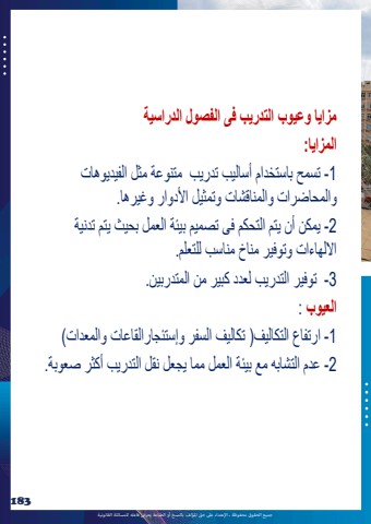 %u062c%u0645%u064a%u0639 %u0627%u0644%u062d%u0642%u0648%u0642 %u0645%u062d%u0641%u0648%u0638%u0629 %u0640 %u0627%u0625%u0644%u0639%u062a%u062f%u0627%u0621 %u0639%u0649%u0644 %u062d%u0642 %u0627%u0645%u0644%u0624%u0644%u0641 %u0628%u0627%u0644%u0646%u0633%u062e %u0623%u0648 %u0627%u0644%u0637%u0628%u0627%u0639%u0629 %u064a%u0639%u0631%u0636 %u0641%u0627%u0639%u0644%u0647 %u0644%u0644%u0645%u0633%u0627%u0626%u0644%u0629 %u0627%u0644%u0642%u0627%u0646%u0648%u0646%u064a%u0629183%u0645%u0632%u0627%u064a%u0627 %u0648%u0639%u064a%u0648%u0628 %u0627%u0644%u062a%u062f%u0631%u064a%u0628 %u0641%u0649 %u0627%u0644%u0641%u0635%u0648%u0644 %u0627%u0644%u062f%u0631%u0627%u0633%u064a%u0629 %u0627%u0644%u0645%u0632%u0627%u064a%u0627: 1 -%u062a%u0633%u0645%u062d %u0628%u0627%u0633%u062a%u062e%u062f%u0627%u0645 %u0623%u0633%u0627%u0644%u064a%u0628 %u062a%u062f%u0631%u064a%u0628 %u0645%u062a%u0646%u0648%u0639%u0629 %u0645%u062b%u0644 %u0627%u0644%u0641%u064a%u062f%u064a%u0648%u0647%u0627%u062a %u0648%u0627%u0644%u0645%u062d%u0627%u0636%u0631%u0627%u062a %u0648%u0627%u0644%u0645%u0646%u0627%u0642%u0634%u0627%u062a %u0648%u062a%u0645%u062b%u064a%u0644 %u0627%u0623%u0644%u062f%u0648%u0627%u0631 %u0648%u063a%u064a%u0631%u0647%u0627.2 -%u064a%u0645%u0643%u0646 %u0623%u0646 %u064a%u062a%u0645 %u0627%u0644%u062a%u062d%u0643%u0645 %u0641%u0649 %u062a%u0635%u0645%u064a%u0645 %u0628%u064a%u0626%u0629 %u0627%u0644%u0639%u0645%u0644 %u0628%u062d%u064a%u062b %u064a%u062a%u0645 %u062a%u062f%u0646%u064a%u0629 %u0627%u0627%u0644%u0644%u0647%u0627%u0621%u0627%u062a %u0648%u062a%u0648%u0641%u064a%u0631 %u0645%u0646%u0627%u062e %u0645%u0646%u0627%u0633%u0628 %u0644%u0644%u062a%u0639%u0644%u0645. 3 -%u062a%u0648%u0641%u064a%u0631 %u0627%u0644%u062a%u062f%u0631%u064a%u0628 %u0644%u0639%u062f%u062f %u0643%u0628%u064a%u0631 %u0645%u0646 %u0627%u0644%u0645%u062a%u062f%u0631%u0628%u064a%u0646.%u0627%u0644%u0639%u064a%u0648%u0628 :1 -%u0627%u0631%u062a%u0641%u0627%u0639 %u0627%u0644%u062a%u0643%u0627%u0644%u064a%u0641) %u062a%u0643%u0627%u0644%u064a%u0641 %u0627%u0644%u0633%u0641%u0631 %u0648%u0625%u0633%u062a%u0626%u062c%u0627%u0631%u0627%u0644%u0642%u0627%u0639%u0627%u062a %u0648%u0627%u0644%u0645%u0639%u062f%u0627%u062a(2 -%u0639%u062f%u0645 %u0627%u0644%u062a%u0634%u0627%u0628%u0647 %u0645%u0639 %u0628%u064a%u0626%u0629 %u0627%u0644%u0639%u0645%u0644 %u0645%u0645%u0627 %u064a%u062c%u0639%u0644 %u0646%u0642%u0644 %u0627%u0644%u062a%u062f%u0631%u064a%u0628 %u0623%u0643%u062b%u0631 %u0635%u0639%u0648%u0628%u0629.