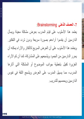 %u062c%u0645%u064a%u0639 %u0627%u0644%u062d%u0642%u0648%u0642 %u0645%u062d%u0641%u0648%u0638%u0629 %u0640 %u0627%u0625%u0644%u0639%u062a%u062f%u0627%u0621 %u0639%u0649%u0644 %u062d%u0642 %u0627%u0645%u0644%u0624%u0644%u0641 %u0628%u0627%u0644%u0646%u0633%u062e %u0623%u0648 %u0627%u0644%u0637%u0628%u0627%u0639%u0629 %u064a%u0639%u0631%u0636 %u0641%u0627%u0639%u0644%u0647 %u0644%u0644%u0645%u0633%u0627%u0626%u0644%u0629 %u0627%u0644%u0642%u0627%u0646%u0648%u0646%u064a%u06291957 -%u0627%u0644%u0639%u0635%u0641 %u0627%u0644%u0630%u0647%u0646%u064a Brainstorming:%u064a%u0639%u062a%u0645%u062f %u0647%u0630%u0627 %u0627%u0623%u0644%u0633%u0644%u0648%u0628 %u0639%u0644%u0649 %u0642%u064a%u0627%u0645 %u0627%u0644%u0645%u062f%u0631%u0628 %u0628%u0639%u0631%u0636 %u0645%u0634%u0643%u0644%u0629 %u0645%u0639%u064a%u0646%u0629 %u0648%u064a%u0633%u0623%u0644%u0627%u0644%u062f%u0627%u0631%u0633%u064a%u0646 %u0623%u0646 %u064a%u0642%u062f%u0645%u0648%u0627 %u0622%u0631%u0627%u0621%u0647%u0645 %u0628%u0635%u0648%u0631%u0629 %u0633%u0631%u064a%u0639%u0629 %u0648%u062f%u0648%u0646 %u062a%u0631%u062f%u062f %u0641%u064a %u0627%u0644%u062a%u0641%u0643%u064a%u0631.%u0648%u064a%u0639%u062a%u0645%u062f %u0647%u0630%u0627 %u0627%u0623%u0644%u0633%u0644%u0648%u0628 %u0639%u0644%u0649 %u0623%u0646 %u0627%u0644%u0639%u0631%u0636 %u0627%u0644%u0633%u0631%u064a%u0639 %u0644%u0623%u0644%u0641%u0643%u0627%u0631 %u0648%u0627%u0622%u0644%u0631%u0627%u0621 %u064a%u0645%u0643%u0646%u0647 %u0623%u0646%u064a%u062d%u0631%u0631 %u0627%u0644%u062f%u0627%u0631%u0633%u064a%u0646 %u0645%u0646 %u0627%u0644%u062c%u0645%u0648%u062f %u0648%u064a%u0634%u062c%u0639%u0647%u0645 %u0639%u0644%u0649 %u0627%u0644%u0645%u0634%u0627%u0631%u0643%u0629%u060c %u0643%u0645%u0627 %u0623%u0646 %u0643%u0645 %u0627%u0622%u0644%u0631%u0627%u0621%u0627%u0644%u063a%u0632%u064a%u0631%u0629 %u0643%u0641%u064a%u0644 %u0628%u062a%u063a%u0637%u064a%u0629 %u062c%u0648%u0627%u0646%u0628 %u0627%u0644%u0645%u0648%u0636%u0648%u0639 %u0623%u0648 %u0627%u0644%u0645%u0634%u0643%u0644%u0629 %u0627%u0644%u062a%u064a %u0623%u062b%u0627%u0631%u0647%u0627%u0627%u0644%u0645%u062f%u0631%u0628%u060c %u0645%u0645%u0627 %u064a%u0633%u0647%u0644 %u0627%u0644%u0645%u062f%u0631%u0628 %u0639%u0644%u0649 %u0627%u0644%u0639%u0631%u0636 %u0648%u064a%u0634%u062c%u0639 %u0627%u0644%u062b%u0642%u0629 %u0641%u064a %u0646%u0641%u0648%u0633%u0627%u0644%u062f%u0627%u0631%u0633%u064a%u0646 %u0648%u064a%u062d%u0645%u0633%u0647%u0645 %u0644%u0644%u062a%u062f%u0631%u064a%u0628.