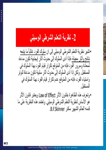 %u062c%u0645%u064a%u0639 %u0627%u0644%u062d%u0642%u0648%u0642 %u0645%u062d%u0641%u0648%u0638%u0629 %u0640 %u0627%u0625%u0644%u0639%u062a%u062f%u0627%u0621 %u0639%u0649%u0644 %u062d%u0642 %u0627%u0645%u0644%u0624%u0644%u0641 %u0628%u0627%u0644%u0646%u0633%u062e %u0623%u0648 %u0627%u0644%u0637%u0628%u0627%u0639%u0629 %u064a%u0639%u0631%u0636 %u0641%u0627%u0639%u0644%u0647 %u0644%u0644%u0645%u0633%u0627%u0626%u0644%u0629 %u0627%u0644%u0642%u0627%u0646%u0648%u0646%u064a%u062987%u2022%u062a%u0634%u064a%u0631 %u0646%u0638%u0631%u064a%u0629 %u0627%u0644%u062a%u0639%u0644%u0645 %u0627%u0644%u0634%u0631%u0637%u064a %u0627%u0644%u0648%u0633%u064a%u0644%u064a %u0625%u0644%u0649 %u0627%u0646 %u0645%u0627 %u064a%u062a%u0628%u0639%u0647%u064b%u0633%u0644%u0648%u0643 %u0627%u0644%u0641%u0631%u062f %u063a%u0627%u0644%u0628%u0627%u0646%u062a%u0627%u0626%u062c %u0648%u0622%u062b%u0627%u0631 %u0645%u0639%u064a%u0646%u0629%u060c %u0641%u0625%u0630%u0627 %u0623%u062f%u0649 %u0627%u0644%u0633%u0644%u0648%u0643 %u0625%u0644%u0649 %u062d%u062f%u0648%u062b %u0622%u062b%u0627%u0631 %u0625%u064a%u062c%u0627%u0628%u064a%u0629 %u062a%u0643%u0648%u0646 %u0645%u062f%u0639%u0627%u0647 %u0644%u0633%u0639%u0627%u062f%u0629 %u0648%u0633%u0631%u0648%u0631 %u0627%u0644%u0641%u0631%u062f %u0641%u0625%u0646%u0647 %u0645%u0646 %u0627%u0644%u0645%u062a%u0648%u0642%u0639 %u062a%u0643%u0631%u0627%u0631 %u0642%u064a%u0627%u0645 %u0627%u0644%u0641%u0631%u062f %u0628%u0647%u0630%u0627 %u0627%u0644%u0633%u0644%u0648%u0643 %u0641%u064a %u0627%u0644%u0645%u0633%u062a%u0642%u0628%u0644. %u0648%u0644%u0643%u0646 %u0625%u0630%u0627 %u0623%u062f%u0649 %u0627%u0644%u0633%u0644%u0648%u0643 %u0625%u0644%u0649 %u062d%u062f%u0648%u062b %u0622%u062b%u0627%u0631 %u0633%u0644%u0628%u064a%u0629 %u062a%u0643%u0648%u0646 %u0645%u062f%u0639%u0627%u0629 %u0644%u062a%u0648%u062a%u0631 %u0648%u0627%u0633%u062a%u064a%u0627%u0621 %u0627%u0644%u0641%u0631%u062f%u060c %u0641%u0625%u0646%u0647 %u0645%u0646 %u0627%u0644%u0645%u062a%u0648%u0642%u0639 %u0639%u062f%u0645 %u062a%u0643%u0631%u0627%u0631 %u0642%u064a%u0627%u0645 %u0627%u0644%u0641%u0631%u062f %u0628%u0647%u0630%u0627 %u0627%u0644%u0633%u0644%u0648%u0643 %u0641%u064a %u0627%u0644%u0645%u0633%u062a%u0642%u0628%u0644. %u2022 %u0648%u062a%u0639%u0631%u0641 %u0647%u0630%u0647 %u0627%u0644%u0638%u0627%u0647%u0631%u0629 %u0628%u0642%u0627%u0646%u0648%u0646 %u0627%u0623%u0644%u062b%u0631 Effect of Law %u0648%u064a%u0639%u062a%u0628%u0631 %u0642%u0627%u0646%u0648%u0646 %u0627%u0623%u0644%u062b%u0631 %u0647%u0648 %u0627%u0623%u0644%u0633%u0627%u0633 %u0644%u0646%u0638%u0631%u064a%u0629 %u0627%u0644%u062a%u0639%u0644%u0645 %u0627%u0644%u0634%u0631%u0637%u064a %u0627%u0644%u0648%u0633%u064a%u0644%u064a. %u0648%u062a%u0639%u062a%u0645%u062f %u0647%u0630%u0647 %u0627%u0644%u0646%u0638%u0631%u064a%u0629 %u0639%u0644%u0649 %u0645%u0627 %u0642%u062f%u0645%u0647 %u0627%u0644%u0639%u0627%u0644%u0645 %u0627%u0644%u0634%u0647%u064a%u0631 %u0633%u0643%u0646%u0631 Skinner.F.B.2 -%u0646%u0638%u0631%u064a%u0629 %u0627%u0644%u062a%u0639%u0644%u0645 %u0627%u0644%u0634%u0631%u0637%u064a %u0627%u0644%u0648%u0633%u064a%u0644%u064a