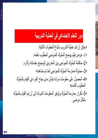 %u062c%u0645%u064a%u0639 %u0627%u0644%u062d%u0642%u0648%u0642 %u0645%u062d%u0641%u0648%u0638%u0629 %u0640 %u0627%u0625%u0644%u0639%u062a%u062f%u0627%u0621 %u0639%u0649%u0644 %u062d%u0642 %u0627%u0645%u0644%u0624%u0644%u0641 %u0628%u0627%u0644%u0646%u0633%u062e %u0623%u0648 %u0627%u0644%u0637%u0628%u0627%u0639%u0629 %u064a%u0639%u0631%u0636 %u0641%u0627%u0639%u0644%u0647 %u0644%u0644%u0645%u0633%u0627%u0626%u0644%u0629 %u0627%u0644%u0642%u0627%u0646%u0648%u0646%u064a%u062991%u062f%u0648%u0631 %u0627%u0644%u062a%u0639%u0644%u0645 %u0627%u0627%u0644%u062c%u062a%u0645%u0627%u0639%u0649 %u0641%u0649 %u0627%u0644%u0639%u0645%u0644%u064a%u0629 %u0627%u0644%u062a%u062f%u0631%u064a%u0628%u064a%u0629 %u2022%u064a%u0645%u0643%u0646 %u0623%u0646 %u062a%u062a%u0645 %u0639%u0645%u0644%u064a%u0629 %u0627%u0644%u062a%u062f%u0631%u064a%u0628 %u0628%u0627%u062a%u0628%u0627%u0639 %u0627%u0644%u062e%u0637%u0648%u0627%u062a %u0627%u0644%u062a%u0627%u0644%u064a%u0629: %u2022 1 -%u0639%u0631%u0636 %u0641%u064a%u0644%u0645 %u064a%u0648%u0636%u062d %u0627%u0644%u0633%u0644%u0648%u0643 %u0627%u0644%u0646%u0645%u0648%u0630%u062c%u0649 %u0627%u0644%u0645%u0637%u0644%u0648%u0628 %u062a%u0639%u0644%u0645%u0647.%u2022 2 -%u0645%u0646%u0627%u0642%u0634%u0629 %u0627%u0644%u0633%u0644%u0648%u0643 %u0627%u0644%u0646%u0645%u0648%u0630%u062c%u0649 %u0628%u064a%u0646 %u0627%u0644%u0645%u062a%u062f%u0631%u0628%u064a%u0646 %u0644%u062a%u0648%u0636%u064a%u062d %u0645%u0642%u062f%u0645%u0627%u062a%u0647 %u0648%u0623%u062b%u0627%u0631%u0647.%u2022 3 -%u0645%u062d%u0627%u0648%u0644%u0629 %u0645%u0645%u0627%u0631%u0633%u0629 %u0627%u0644%u0633%u0644%u0648%u0643 %u0627%u0644%u0646%u0645%u0648%u0630%u062c%u0649 %u0643%u0645%u0627 %u062a%u0645 %u0645%u0634%u0627%u0647%u062f%u062a%u0647%u2022 4 -%u0627%u0644%u062d%u0635%u0648%u0644 %u0639%u0644%u0649 %u0645%u0639%u0644%u0648%u0645%u0627%u062a %u0645%u0631%u062a%u062f%u0629 %u0628%u0634%u0623%u0646 %u0645%u062f%u0649 %u0646%u062c%u0627%u062d %u0627%u0644%u0641%u0631%u062f %u0641%u0649 %u0627%u0644%u0642%u064a%u0627%u0645 %u0628%u0627%u0644%u0633%u0644%u0648%u0643 %u0627%u0644%u0645%u0637%u0644%u0648%u0628 %u0627%u0643%u062a%u0633%u0627%u0628%u0647%u2022 5 -%u062a%u0643%u0631%u0627%u0631 %u0645%u0645%u0627%u0631%u0633%u0629 %u0627%u0644%u0633%u0644%u0648%u0643 %u0648%u062a%u0648%u0641%u064a%u0631 %u0627%u0644%u0645%u0639%u0644%u0648%u0645%u0627%u062a %u0627%u0644%u0645%u0631%u062a%u062f%u0629 %u0625%u0644%u0649 %u0623%u0646 %u064a%u062a%u0645 %u0627%u0644%u0642%u064a%u0627%u0645 %u0628%u0627%u0644%u0633%u0644%u0648%u0643 %u0628%u0634%u0643%u0644 %u0645%u0631%u0636%u0649 .
