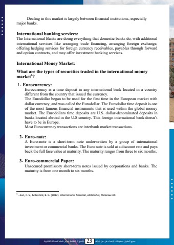 %u062c%u0645%u064a%u0639 %u0627%u0644%u062d%u0642%u0648%u0642 %u0645%u062d%u0641%u0648%u0638%u0629 %u0640 %u0627%u0625%u0644%u0639%u062a%u062f%u0627%u0621 %u0639%u0649%u0644 %u062d%u0642 %u0627%u0645%u0644%u0624%u0644%u0641 23 %u0628%u0627%u0644%u0646%u0633%u062e %u0623%u0648 %u0627%u0644%u0637%u0628%u0627%u0639%u0629 %u064a%u0639%u0631%u0636 %u0641%u0627%u0639%u0644%u0647 %u0644%u0644%u0645%u0633%u0627%u0626%u0644%u0629 %u0627%u0644%u0642%u0627%u0646%u0648%u0646%u064a%u0629Dealing in this market is largely between financial institutions, especially major banks.International banking services:The International Banks are doing everything that domestic banks do, with additional international services like arranging trade financing, arranging foreign exchange, offering hedging services for foreign currency receivables, payables through forward and option contracts, and may offer investment banking services.International Money Market:What are the types of securities traded in the international money market6?1- Eurocurrency:Eurocurrency is a time deposit in any international bank located in a country different from the country that issued the currency.The Eurodollar began to be used for the first time in the European market with dollar currency, and was called the Eurodollar. The Eurodollar time deposit is one of the most famous financial instruments that is used within the global money market. The Eurodollars time deposits are U.S. dollar-denominated deposits in banks located abroad in the U.S country. This foreign international bank doesn%u2019t have to be in Europe.Most Eurocurrency transactions are interbank market transactions.2- Euro-note:A Euro-note is a short-term note underwritten by a group of international investment or commercial banks. The Euro note is sold at a discount rate and pays back the full face value at maturity. The maturity ranges from three to six months.3- Euro-commercial Paper:Unsecured promissory short-term notes issued by corporations and banks. The maturity is from one month to six months.6 --Eun, C. S., & Resnick, B. G. (2012). International financial, edition Six, McGraw Hill.