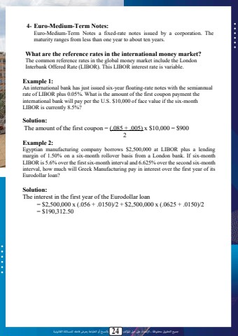 %u062c%u0645%u064a%u0639 %u0627%u0644%u062d%u0642%u0648%u0642 %u0645%u062d%u0641%u0648%u0638%u0629 %u0640 %u0627%u0625%u0644%u0639%u062a%u062f%u0627%u0621 %u0639%u0649%u0644 %u062d%u0642 %u0627%u0645%u0644%u0624%u0644%u0641 24 %u0628%u0627%u0644%u0646%u0633%u062e %u0623%u0648 %u0627%u0644%u0637%u0628%u0627%u0639%u0629 %u064a%u0639%u0631%u0636 %u0641%u0627%u0639%u0644%u0647 %u0644%u0644%u0645%u0633%u0627%u0626%u0644%u0629 %u0627%u0644%u0642%u0627%u0646%u0648%u0646%u064a%u06294- Euro-Medium-Term Notes:Euro-Medium-Term Notes a fixed-rate notes issued by a corporation. The maturity ranges from less than one year to about ten years.What are the reference rates in the international money market? The common reference rates in the global money market include the London Interbank Offered Rate (LIBOR). This LIBOR interest rate is variable.Example 1:An international bank has just issued six-year floating-rate notes with the semiannual rate of LIBOR plus 0.05%. What is the amount of the first coupon payment the international bank will pay per the U.S. $10,000 of face value if the six-month LIBOR is currently 8.5%?Solution:The amount of the first coupon = (.085 + .005) x $10,000 = $9002Example 2:Egyptian manufacturing company borrows $2,500,000 at LIBOR plus a lending margin of 1.50% on a six-month rollover basis from a London bank. If six-month LIBOR is 5.6% over the first six-month interval and 6.625% over the second six-month interval, how much will Greek Manufacturing pay in interest over the first year of its Eurodollar loan?Solution:The interest in the first year of the Eurodollar loan= $2,500,000 x (.056 + .0150)/2 + $2,500,000 x (.0625 + .0150)/2= $190,312.50