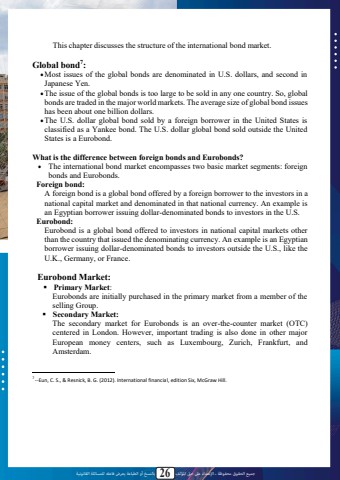 %u062c%u0645%u064a%u0639 %u0627%u0644%u062d%u0642%u0648%u0642 %u0645%u062d%u0641%u0648%u0638%u0629 %u0640 %u0627%u0625%u0644%u0639%u062a%u062f%u0627%u0621 %u0639%u0649%u0644 %u062d%u0642 %u0627%u0645%u0644%u0624%u0644%u0641 26 %u0628%u0627%u0644%u0646%u0633%u062e %u0623%u0648 %u0627%u0644%u0637%u0628%u0627%u0639%u0629 %u064a%u0639%u0631%u0636 %u0641%u0627%u0639%u0644%u0647 %u0644%u0644%u0645%u0633%u0627%u0626%u0644%u0629 %u0627%u0644%u0642%u0627%u0646%u0648%u0646%u064a%u0629This chapter discusses the structure of the international bond market.Global bond7:%uf0b7Most issues of the global bonds are denominated in U.S. dollars, and second in Japanese Yen.%uf0b7The issue of the global bonds is too large to be sold in any one country. So, global bonds are traded in the major world markets. The average size of global bond issues has been about one billion dollars.%uf0b7The U.S. dollar global bond sold by a foreign borrower in the United States is classified as a Yankee bond. The U.S. dollar global bond sold outside the United States is a Eurobond.What is the difference between foreign bonds and Eurobonds?%uf0b7 The international bond market encompasses two basic market segments: foreign bonds and Eurobonds.Foreign bond:A foreign bond is a global bond offered by a foreign borrower to the investors in a national capital market and denominated in that national currency. An example is an Egyptian borrower issuing dollar-denominated bonds to investors in the U.S.Eurobond:Eurobond is a global bond offered to investors in national capital markets other than the country that issued the denominating currency. An example is an Egyptian borrower issuing dollar-denominated bonds to investors outside the U.S., like the U.K., Germany, or France.Eurobond Market:%uf0a7 Primary Market:Eurobonds are initially purchased in the primary market from a member of the selling Group.%uf0a7 Secondary Market:The secondary market for Eurobonds is an over-the-counter market (OTC) centered in London. However, important trading is also done in other major European money centers, such as Luxembourg, Zurich, Frankfurt, and Amsterdam.7 --Eun, C. S., & Resnick, B. G. (2012). International financial, edition Six, McGraw Hill.