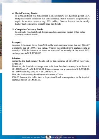 %u062c%u0645%u064a%u0639 %u0627%u0644%u062d%u0642%u0648%u0642 %u0645%u062d%u0641%u0648%u0638%u0629 %u0640 %u0627%u0625%u0644%u0639%u062a%u062f%u0627%u0621 %u0639%u0649%u0644 %u062d%u0642 %u0627%u0645%u0644%u0624%u0644%u0641 28 %u0628%u0627%u0644%u0646%u0633%u062e %u0623%u0648 %u0627%u0644%u0637%u0628%u0627%u0639%u0629 %u064a%u0639%u0631%u0636 %u0641%u0627%u0639%u0644%u0647 %u0644%u0644%u0645%u0633%u0627%u0626%u0644%u0629 %u0627%u0644%u0642%u0627%u0646%u0648%u0646%u064a%u06294- Dual-Currency Bonds:Is a straight fixed-rate bond issued in one currency, say, Egyptian pound EGP, that pays coupon interest in that same currency. But at maturity, the principal is repaid in another currency, say, U.S. dollars. Coupon interest rate is usually higher than comparable straight fixed-rate bonds.5- Composite Currency Bonds:Is a straight fixed-rate bond denominated in a currency basket. Often called currency cocktail bonds.Example1:Consider 8.5 percent Swiss franc/U.S. dollar dual-currency bonds that pay $666.67 at maturity per SF1,000 of par value. What is the implicit SF/$ exchange rate at maturity? Will the investor be better or worse off at maturity if the actual SF/$ exchange rate is SF1.35/$1.00?Solution:Implicitly, the dual currency bonds call for the exchange of SF1,000 of face value for $666.67.Therefore, the implicit exchange rate built into the dual currency bond issue is SF1,000/$666.67, or SF1.50/$1.00. If the exchange rate at maturity is SF1.35/$1.00, SF1,000 would buy $740.74 = SF1,000/SF1.35.Thus, the dual currency bond investor is worse off with$666.67 because the dollar is at a depreciated level in comparison to the implicit exchange rate of SF1.50/$1.00.