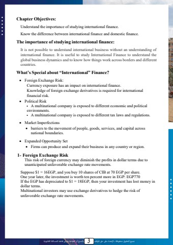 %u062c%u0645%u064a%u0639 %u0627%u0644%u062d%u0642%u0648%u0642 %u0645%u062d%u0641%u0648%u0638%u0629 %u0640 %u0627%u0625%u0644%u0639%u062a%u062f%u0627%u0621 %u0639%u0649%u0644 %u062d%u0642 %u0627%u0645%u0644%u0624%u0644%u0641 3 %u0628%u0627%u0644%u0646%u0633%u062e %u0623%u0648 %u0627%u0644%u0637%u0628%u0627%u0639%u0629 %u064a%u0639%u0631%u0636 %u0641%u0627%u0639%u0644%u0647 %u0644%u0644%u0645%u0633%u0627%u0626%u0644%u0629 %u0627%u0644%u0642%u0627%u0646%u0648%u0646%u064a%u0629Chapter Objectives:Understand the importance of studying international finance.Know the difference between international finance and domestic finance.The importance of studying international finance:It is not possible to understand international business without an understanding of international finance. It is useful to study International Finance to understand the global business dynamics and to know how things work across borders and different countries.What%u2019s Special about %u201cInternational%u201d Finance?%uf0b7 Foreign Exchange Risk:Currency exposure has an impact on international finance.Knowledge of foreign exchange derivatives is required for international financial risk.%uf0b7 Political Risk%uf0a7 A multinational company is exposed to different economic and political environments.%uf0a7 A multinational company is exposed to different tax laws and regulations.%uf0b7 Market Imperfections%uf0b7 barriers to the movement of people, goods, services, and capital across national boundaries.%uf0b7 Expanded Opportunity Set%uf0b7 Firms can produce and expand their business in any country or region.1- Foreign Exchange RiskThis risk of foreign currency may diminish the profits in dollar terms due to unanticipated unfavorable exchange rate movements.Suppose $1 = 16EGP, and you buy 10 shares of CIB at 70 EGP per share. One year later, the investment is worth ten percent more in EGP: EGP770If the EGP has depreciated to $1 = 18EGP, then your investment has lost money in dollar terms.Multinational investors may use exchange derivatives to hedge the risk of unfavorable exchange rate movements.