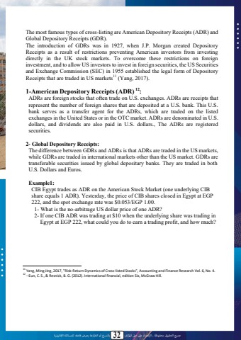 %u062c%u0645%u064a%u0639 %u0627%u0644%u062d%u0642%u0648%u0642 %u0645%u062d%u0641%u0648%u0638%u0629 %u0640 %u0627%u0625%u0644%u0639%u062a%u062f%u0627%u0621 %u0639%u0649%u0644 %u062d%u0642 %u0627%u0645%u0644%u0624%u0644%u0641 32 %u0628%u0627%u0644%u0646%u0633%u062e %u0623%u0648 %u0627%u0644%u0637%u0628%u0627%u0639%u0629 %u064a%u0639%u0631%u0636 %u0641%u0627%u0639%u0644%u0647 %u0644%u0644%u0645%u0633%u0627%u0626%u0644%u0629 %u0627%u0644%u0642%u0627%u0646%u0648%u0646%u064a%u0629The most famous types of cross-listing are American Depository Receipts (ADR) and Global Depository Receipts (GDR).The introduction of GDRs was in 1927, when J.P. Morgan created Depository Receipts as a result of restrictions preventing American investors from investing directly in the UK stock markets. To overcome these restrictions on foreign investment, and to allow US investors to invest in foreign securities, the US Securities and Exchange Commission (SEC) in 1955 established the legal form of Depository Receipts that are traded in US markets11 (Yang, 2017).1-American Depository Receipts (ADR) 12:ADRs are foreign stocks that often trade on U.S. exchanges. ADRs are receipts that represent the number of foreign shares that are deposited at a U.S. bank. This U.S. bank serves as a transfer agent for the ADRs, which are traded on the listed exchanges in the United States or in the OTC market. ADRs are denominated in U.S. dollars, and dividends are also paid in U.S. dollars., The ADRs are registered securities.2- Global Depository Receipts:The difference between GDRs and ADRs is that ADRs are traded in the US markets, while GDRs are traded in international markets other than the US market. GDRs are transferable securities issued by global depositary banks. They are traded in bothU.S. Dollars and Euros.Example1:CIB Egypt trades as ADR on the American Stock Market (one underlying CIB share equals 1 ADR). Yesterday, the price of CIB shares closed in Egypt at EGP 222, and the spot exchange rate was $0.053/EGP 1.00.1- What is the no-arbitrage US dollar price of one ADR?2- If one CIB ADR was trading at $10 when the underlying share was trading in Egypt at EGP 222, what could you do to earn a trading profit, and how much?11 Yang, Ming Jing, 2017, \Vol. 6, No. 4. 12 --Eun, C. S., & Resnick, B. G. (2012). International financial, edition Six, McGraw Hill.