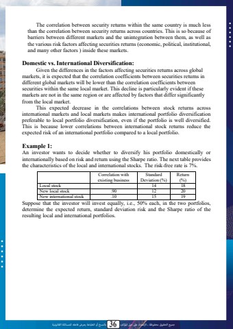 %u062c%u0645%u064a%u0639 %u0627%u0644%u062d%u0642%u0648%u0642 %u0645%u062d%u0641%u0648%u0638%u0629 %u0640 %u0627%u0625%u0644%u0639%u062a%u062f%u0627%u0621 %u0639%u0649%u0644 %u062d%u0642 %u0627%u0645%u0644%u0624%u0644%u0641 36 %u0628%u0627%u0644%u0646%u0633%u062e %u0623%u0648 %u0627%u0644%u0637%u0628%u0627%u0639%u0629 %u064a%u0639%u0631%u0636 %u0641%u0627%u0639%u0644%u0647 %u0644%u0644%u0645%u0633%u0627%u0626%u0644%u0629 %u0627%u0644%u0642%u0627%u0646%u0648%u0646%u064a%u0629The correlation between security returns within the same country is much less than the correlation between security returns across countries. This is so because of barriers between different markets and the unintegration between them, as well as the various risk factors affecting securities returns (economic, political, institutional, and many other factors ) inside these markets.Domestic vs. International Diversification:Given the differences in the factors affecting securities returns across global markets, it is expected that the correlation coefficients between securities returns in different global markets will be lower than the correlation coefficients between securities within the same local market. This decline is particularly evident if these markets are not in the same region or are affected by factors that differ significantly from the local market.This expected decrease in the correlations between stock returns across international markets and local markets makes international portfolio diversification preferable to local portfolio diversification, even if the portfolio is well diversified. This is because lower correlations between international stock returns reduce the expected risk of an international portfolio compared to a local portfolio.Example 1:An investor wants to decide whether to diversify his portfolio domestically or internationally based on risk and return using the Sharpe ratio. The next table provides the characteristics of the local and international stocks. The risk-free rate is 7%.Correlation with existing businessStandard Deviation (%)Return (%)Local stock 14 18New local stock .90 12 20New international stock .10 15 19Suppose that the investor will invest equally, i.e., 50% each, in the two portfolios, determine the expected return, standard deviation risk and the Sharpe ratio of the resulting local and international portfolios.
