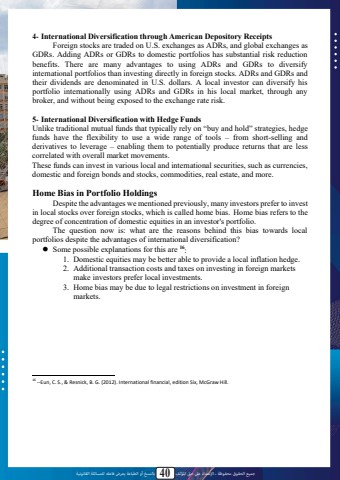 %u062c%u0645%u064a%u0639 %u0627%u0644%u062d%u0642%u0648%u0642 %u0645%u062d%u0641%u0648%u0638%u0629 %u0640 %u0627%u0625%u0644%u0639%u062a%u062f%u0627%u0621 %u0639%u0649%u0644 %u062d%u0642 %u0627%u0645%u0644%u0624%u0644%u0641 40 %u0628%u0627%u0644%u0646%u0633%u062e %u0623%u0648 %u0627%u0644%u0637%u0628%u0627%u0639%u0629 %u064a%u0639%u0631%u0636 %u0641%u0627%u0639%u0644%u0647 %u0644%u0644%u0645%u0633%u0627%u0626%u0644%u0629 %u0627%u0644%u0642%u0627%u0646%u0648%u0646%u064a%u06294- International Diversification through American Depository ReceiptsForeign stocks are traded on U.S. exchanges as ADRs, and global exchanges as GDRs. Adding ADRs or GDRs to domestic portfolios has substantial risk reduction benefits. There are many advantages to using ADRs and GDRs to diversify international portfolios than investing directly in foreign stocks. ADRs and GDRs and their dividends are denominated in U.S. dollars. A local investor can diversify his portfolio internationally using ADRs and GDRs in his local market, through any broker, and without being exposed to the exchange rate risk.5- International Diversification with Hedge FundsUnlike traditional mutual funds that typically rely on %u201cbuy and hold%u201d strategies, hedge funds have the flexibility to use a wide range of tools %u2013 from short-selling and derivatives to leverage %u2013 enabling them to potentially produce returns that are less correlated with overall market movements.These funds can invest in various local and international securities, such as currencies, domestic and foreign bonds and stocks, commodities, real estate, and more.Home Bias in Portfolio HoldingsDespite the advantages we mentioned previously, many investors prefer to invest in local stocks over foreign stocks, which is called home bias. Home bias refers to the degree of concentration of domestic equities in an investor's portfolio.The question now is: what are the reasons behind this bias towards local portfolios despite the advantages of international diversification?%uf06c Some possible explanations for this are 16:1. Domestic equities may be better able to provide a local inflation hedge.2. Additional transaction costs and taxes on investing in foreign markets make investors prefer local investments.3. Home bias may be due to legal restrictions on investment in foreign markets.16 --Eun, C. S., & Resnick, B. G. (2012). International financial, edition Six, McGraw Hill.