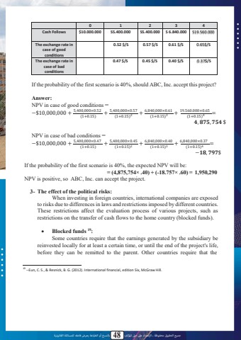 %u062c%u0645%u064a%u0639 %u0627%u0644%u062d%u0642%u0648%u0642 %u0645%u062d%u0641%u0648%u0638%u0629 %u0640 %u0627%u0625%u0644%u0639%u062a%u062f%u0627%u0621 %u0639%u0649%u0644 %u062d%u0642 %u0627%u0645%u0644%u0624%u0644%u0641 48 %u0628%u0627%u0644%u0646%u0633%u062e %u0623%u0648 %u0627%u0644%u0637%u0628%u0627%u0639%u0629 %u064a%u0639%u0631%u0636 %u0641%u0627%u0639%u0644%u0647 %u0644%u0644%u0645%u0633%u0627%u0626%u0644%u0629 %u0627%u0644%u0642%u0627%u0646%u0648%u0646%u064a%u06290 1 2 3 4Cash Follows $10.000.000 S5.400.000 S5.400.000 S 6.840.000 S19.560.000The exchange rate in case of goodconditions0.52 $/S 0.57 $/S 0.61 $/S 0.65$/SThe exchange rate in case of badconditions0.47 $/S 0.45 $/S 0.40 $/S 0.37$/SIf the probability of the first scenario is 40%, should ABC, Inc. accept this project?Answer:NPV in case of good conditions =%u2212$10,000,000 + 5,400,000%u00d70.52 + 5,400,000%u00d70.57 + 6,840,000%u00d70.61 + 19.560.000%u00d70.65 = (1+0.15)NPV in case of bad conditions =(1+0.15)2 (1+0.15)3 (1+0.15)4%ud835%udfd2%ud835%udfd2, %ud835%udfd6%ud835%udfd6%ud835%udfd5%ud835%udfd5%ud835%udfd3%ud835%udfd3,%ud835%udfd5%ud835%udfd5%ud835%udfd3%ud835%udfd3%ud835%udfd2%ud835%udfd2 $%u2212$10,000,000 + 5,400,000%u00d70.47 + 5,400,000%u00d70.45 + 6,840,000%u00d70.40 + 6,840,000%u00d70.37 = (1+0.15) (1+0.15)2 (1+0.15)3 (1+0.15)4%u2212%ud835%udfcf%ud835%udfcf%ud835%udfd6%ud835%udfd6, %ud835%udfd5%ud835%udfd5%ud835%udfd7%ud835%udfd7%ud835%udfd5%ud835%udfd5$If the probability of the first scenario is 40%, the expected NPV will be:= (4,875,754%u00d7 .40) + (-18.757%u00d7 .60) = 1,950,290NPV is positive, so ABC, Inc. can accept the project.3- The effect of the political risks:When investing in foreign countries, international companies are exposed to risks due to differences in laws and restrictionsimposed by different countries. These restrictions affect the evaluation process of various projects, such as restrictions on the transfer of cash flows to the home country (blocked funds).%uf0b7 Blocked funds 19:Some countries require that the earnings generated by the subsidiary be reinvested locally for at least a certain time, or until the end of the project's life, before they can be remitted to the parent. Other countries require that the19 --Eun, C. S., & Resnick, B. G. (2012). International financial, edition Six, McGraw Hill.