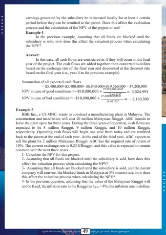 %u062c%u0645%u064a%u0639 %u0627%u0644%u062d%u0642%u0648%u0642 %u0645%u062d%u0641%u0648%u0638%u0629 %u0640 %u0627%u0625%u0644%u0639%u062a%u062f%u0627%u0621 %u0639%u0649%u0644 %u062d%u0642 %u0627%u0645%u0644%u0624%u0644%u0641 49 %u0628%u0627%u0644%u0646%u0633%u062e %u0623%u0648 %u0627%u0644%u0637%u0628%u0627%u0639%u0629 %u064a%u0639%u0631%u0636 %u0641%u0627%u0639%u0644%u0647 %u0644%u0644%u0645%u0633%u0627%u0626%u0644%u0629 %u0627%u0644%u0642%u0627%u0646%u0648%u0646%u064a%u0629earnings generated by the subsidiary be reinvested locally for at least a certain period before they can be remitted to the parent. Does this affect the evaluation process and the calculation of the NPV of the project or not?Example 4In the previous example, assuming that all funds are blocked until the subsidiary is sold, how does this affect the valuation process when calculating the NPV?Answer:In this case, all cash flows are considered as if they will occur in the final year of the project. The cash flows are added together, then converted to dollars based on the exchange rate of the final year and discounted at the discount rate based on the final year (i.e., year 4 in the previous example).Summation of all expected cash flows= S5.400.000+S5.400.000+ S6.840.000+S19.560.000 = 37,200,000NPV in case of good conditions =%u2212$10,000,000 + 37,200,000%u00d70.65(1+0.15)4 = 3,824,993NPV in case of bad conditions =%u2212$10,000,000 + 37,200,000%u00d70.37(1+0.15)4 = %u22122,130,388Example 5BBB Inc., a US MNC, wants to construct a manufacturing plant in Malaysia. The construction and installation will cost 20 million Malaysian Ringgit. ABC intends to leave the plant open for three years. During the three years of operation, cash flows are expected to be 8 million Ringgit, 9 million Ringgit, and 10 million Ringgit, respectively. Operating cash flows will begin one year from today and are remitted back to the parent at the end of each year. At the end of the third year, ABC expects to sell the plant for 2 million Malaysian Ringgit. ABC has the required rate of return of 10%. The current exchange rate is 0.23 $/Ringgit, and this value is expected to remain constant over the next three years.1- Calculate the NPV for this project.2- Assuming that all funds are blocked until the subsidiary is sold, how does this affect the valuation process when calculating the NPV?3- Assuming that all funds are blocked until the subsidiary is sold, and the parent company will reinvest the blocked funds in Malaysia at 5% interest rate, how does this affect the valuation process when calculating the NPV?4- In the previous question, assuming that the value of the Malaysian Ringgit will not be fixed, the inflation rate in the Ringgit is %uf070RIN = 4%, the inflation rate in dollars