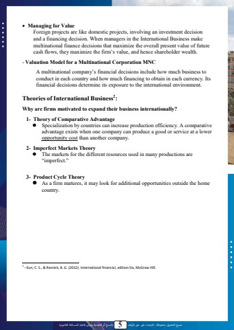 %u062c%u0645%u064a%u0639 %u0627%u0644%u062d%u0642%u0648%u0642 %u0645%u062d%u0641%u0648%u0638%u0629 %u0640 %u0627%u0625%u0644%u0639%u062a%u062f%u0627%u0621 %u0639%u0649%u0644 %u062d%u0642 %u0627%u0645%u0644%u0624%u0644%u0641 5 %u0628%u0627%u0644%u0646%u0633%u062e %u0623%u0648 %u0627%u0644%u0637%u0628%u0627%u0639%u0629 %u064a%u0639%u0631%u0636 %u0641%u0627%u0639%u0644%u0647 %u0644%u0644%u0645%u0633%u0627%u0626%u0644%u0629 %u0627%u0644%u0642%u0627%u0646%u0648%u0646%u064a%u0629%uf0b7 Managing for ValueForeign projects are like domestic projects, involving an investment decision and a financing decision. When managers in the International Business make multinational finance decisions that maximize the overall present value of future cash flows, they maximize the firm%u2019s value, and hence shareholder wealth.- Valuation Model for a Multinational Corporation MNCA multinational company%u2019s financial decisions include how much business to conduct in each country and how much financing to obtain in each currency. Its financial decisions determine its exposure to the international environment.Theories of International Business2:Why are firms motivated to expand their business internationally?1- Theory of Comparative Advantage%uf06c Specialization by countries can increase production efficiency. A comparative advantage exists when one company can produce a good or service at a lower opportunity cost than another company.2- Imperfect Markets Theory%uf06c The markets for the different resources used in many productions are%u201cimperfect.%u201d3- Product Cycle Theory%uf06c As a firm matures, it may look for additional opportunities outside the home country.2 --Eun, C. S., & Resnick, B. G. (2012). International financial, edition Six, McGraw Hill.