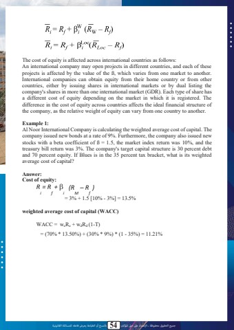 %u062c%u0645%u064a%u0639 %u0627%u0644%u062d%u0642%u0648%u0642 %u0645%u062d%u0641%u0648%u0638%u0629 %u0640 %u0627%u0625%u0644%u0639%u062a%u062f%u0627%u0621 %u0639%u0649%u0644 %u062d%u0642 %u0627%u0645%u0644%u0624%u0644%u0641 54 %u0628%u0627%u0644%u0646%u0633%u062e %u0623%u0648 %u0627%u0644%u0637%u0628%u0627%u0639%u0629 %u064a%u0639%u0631%u0636 %u0641%u0627%u0639%u0644%u0647 %u0644%u0644%u0645%u0633%u0627%u0626%u0644%u0629 %u0627%u0644%u0642%u0627%u0646%u0648%u0646%u064a%u0629The cost of equity is affected across international countries as follows:An international company may open projects in different countries, and each of these projects is affected by the value of the %u00df, which varies from one market to another. International companies can obtain equity from their home country or from other countries, either by issuing shares in international markets or by dual listing the company's shares in more than one international market (GDR). Each type of share has a different cost of equity depending on the market in which it is registered. The difference in the cost of equity across countries affects the ideal financial structure of the company, as the relative weight of equity can vary from one country to another.Example 1:Al Noor International Company is calculating the weighted average cost of capital. The company issued new bonds at a rate of 9%. Furthermore, the company also issued new stocks with a beta coefficient of %u00df = 1.5, the market index return was 10%, and the treasury bill return was 3%. The company's target capital structure is 30 percent debt and 70 percent equity. If Blues is in the 35 percent tax bracket, what is its weighted average cost of capital?Answer:Cost of equity:R = R + %uf062i f i(R %u2013 R )M f= 3% + 1.5 [10% - 3%] = 13.5%weighted average cost of capital (WACC)WACC = weRe + wdRd (1-T)= (70% * 13.50%) + (30% * 9%) * (1 - 35%) = 11.21%