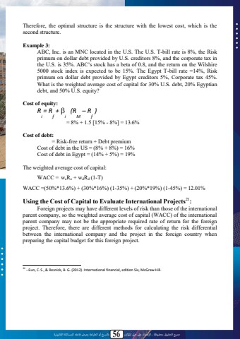 %u062c%u0645%u064a%u0639 %u0627%u0644%u062d%u0642%u0648%u0642 %u0645%u062d%u0641%u0648%u0638%u0629 %u0640 %u0627%u0625%u0644%u0639%u062a%u062f%u0627%u0621 %u0639%u0649%u0644 %u062d%u0642 %u0627%u0645%u0644%u0624%u0644%u0641 56 %u0628%u0627%u0644%u0646%u0633%u062e %u0623%u0648 %u0627%u0644%u0637%u0628%u0627%u0639%u0629 %u064a%u0639%u0631%u0636 %u0641%u0627%u0639%u0644%u0647 %u0644%u0644%u0645%u0633%u0627%u0626%u0644%u0629 %u0627%u0644%u0642%u0627%u0646%u0648%u0646%u064a%u0629Therefore, the optimal structure is the structure with the lowest cost, which is the second structure.Example 3:ABC, Inc. is an MNC located in the U.S. The U.S. T-bill rate is 8%, the Risk primum on dollar debt provided by U.S. creditors 8%, and the corporate tax in the U.S. is 35%. ABC%u2019s stock has a beta of 0.8, and the return on the Wilshire 5000 stock index is expected to be 15%. The Egypt T-bill rate =14%, Risk primum on dollar debt provided by Egypt creditors 5%, Corporate tax 45%. What is the weighted average cost of capital for 30% U.S. debt, 20% Egyptian debt, and 50% U.S. equity?Cost of equity:R = R + %uf062i f i(R %u2013 R )M f= 8% + 1.5 [15% - 8%] = 13.6%Cost of debt:= Risk-free return + Debt premium Cost of debt in the US = (8% + 8%) = 16% Cost of debt in Egypt = (14% + 5%) = 19%The weighted average cost of capital: WACC = weRe + wdRd (1-T)WACC =(50%*13.6%) + (30%*16%) (1-35%) + (20%*19%) (1-45%) = 12.01%Using the Cost of Capital to Evaluate International Projects21:Foreign projects may have different levels of risk than those of the international parent company, so the weighted average cost of capital (WACC) of the international parent company may not be the appropriate required rate of return for the foreign project. Therefore, there are different methods for calculating the risk differential between the international company and the project in the foreign country when preparing the capital budget for this foreign project.21 --Eun, C. S., & Resnick, B. G. (2012). International financial, edition Six, McGraw Hill.