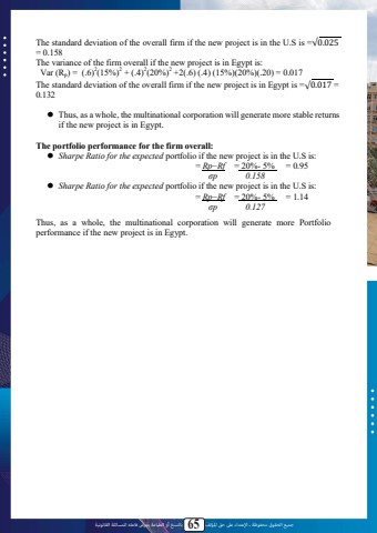 %u062c%u0645%u064a%u0639 %u0627%u0644%u062d%u0642%u0648%u0642 %u0645%u062d%u0641%u0648%u0638%u0629 %u0640 %u0627%u0625%u0644%u0639%u062a%u062f%u0627%u0621 %u0639%u0649%u0644 %u062d%u0642 %u0627%u0645%u0644%u0624%u0644%u0641 65 %u0628%u0627%u0644%u0646%u0633%u062e %u0623%u0648 %u0627%u0644%u0637%u0628%u0627%u0639%u0629 %u064a%u0639%u0631%u0636 %u0641%u0627%u0639%u0644%u0647 %u0644%u0644%u0645%u0633%u0627%u0626%u0644%u0629 %u0627%u0644%u0642%u0627%u0646%u0648%u0646%u064a%u0629The standard deviation of the overall firm if the new project is in the U.S is =%u221a0.025= 0.158The variance of the firm overall if the new project is in Egypt is:Var (Rp) = (.6)2(15%)2 + (.4)2(20%)2 +2(.6) (.4) (15%)(20%)(.20) = 0.017The standard deviation of the overall firm if the new project is in Egypt is =%u221a0.017 = 0.132%uf06c Thus, as a whole, the multinational corporation will generate more stable returns if the new project is in Egypt.The portfolio performance for the firm overall:%uf06c Sharpe Ratio for the expected portfolio if the new project is in the U.S is:= Rp%u2212Rf = 20%- 5% = 0.95%u03c3p 0.158%uf06c Sharpe Ratio for the expected portfolio if the new project is in the U.S is:= Rp%u2212Rf = 20%- 5% = 1.14%u03c3p 0.127Thus, as a whole, the multinational corporation will generate more Portfolioperformance if the new project is in Egypt.